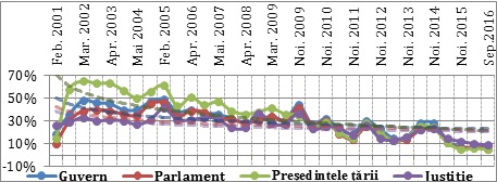 Tabel No.1 Evoluția încrederii cetățenilor în Președinție, Parlament și Guvern (Feb.2001-Sep.2016)