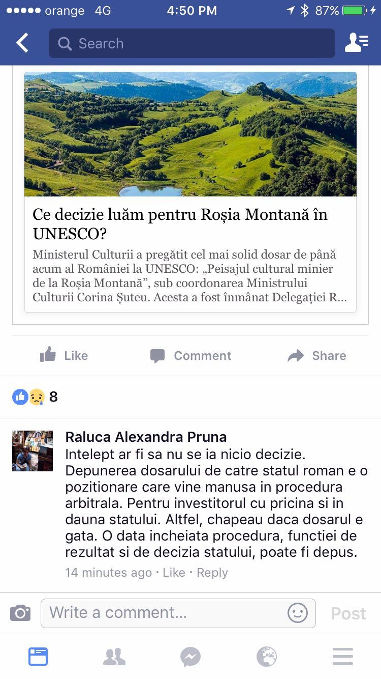 “Înţelept ar fi să nu se ia nicio decizie. Depunerea dosarului de către statul român e o poziţionare care vine mănuşă în procedura arbitrală. Pentru investitorul cu pricina şi în dauna statului”, a scris Raluca Prună pe pagina oficială de Facebook a ministrului Culturii.