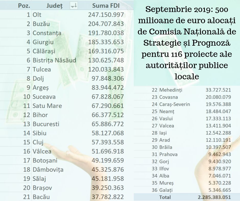 Așadar, primele 7 județe au primit finanțări care depășesc jumătatea valorii alocate în această tranșă de proiecte. Probabil că până la finalul anului mai urmează un calup de proiecte deoarece angajarea bugetară pentru FDI aferentă anului 2019 este de 5 miliarde de lei.