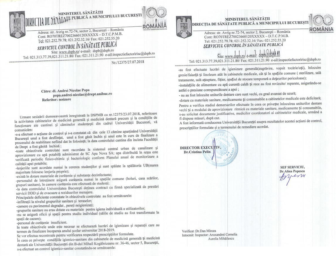 Aflăm de la Cristina Pelin, directorul Direcţiei de Sănătate Publică a Municipiului Bucureşti citat de Adevărul, că Universitatea din București tocmai a fost amendată cu 10.000 de lei pentru condițiile igienico-sanitare neadecvate din căminele Grozăvești ca urmare a sesizării unui student, Andrei-Nicolae Popa, membru în Consiliul director al Asociației Studenților în Drept (ASD).