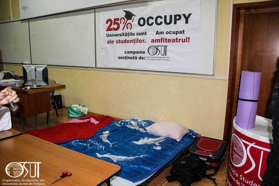 Studenţii au anunţat marţi o decizie radicală: aceea că vor ocupa universităţile în care învaţă. Ei sunt nemulţumiţi că vocea lor nu este ascultată, dar şi că educaţia este subfinanţată. Există deja trei instituţii de învăţământ superior ocupate de organizații studențești: Universitatea de Vest din Timișoara, Universitatea Maritimă din Constanța și Universitatea „Dunărea de Jos” din Galați. Studenții s-au baricadat în amfiteatre, unde dezbat problemele sistemului universitar românesc. Ei refuză să părăsească universitățile până când revendicările lor nu vor fi acceptate.