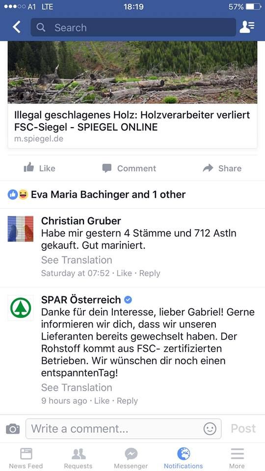 Compania Holzindustrie Schweighofer a pierdut parteneriatul cu SPAR Austria, parte a grupului SPAR, una dintre cele mai mari rețele de magazine din Europa. Într-un răspuns neoficial, dar postat pe pagina oficială a SPAR Austria, retailerul anunță că ”ne-am schimbat deja furnizorii noștri. Materia primă are certificare fermă FSC”. Răspunsul vine după ce Gabriel Păun, de la Agent Green, a postat pe pagina de Facebook a SPAR Austria articolul de săptămâna trecută din Der Spiegel (detalii aici) care informează despre pierderea de către Schweighofer a certificării de sustenabilitate FSC (certificare care ar trebui să garateze că materia primă este exploatată sustenabil, implicit faptul că nu a fost furată – mai multe detalii aici).