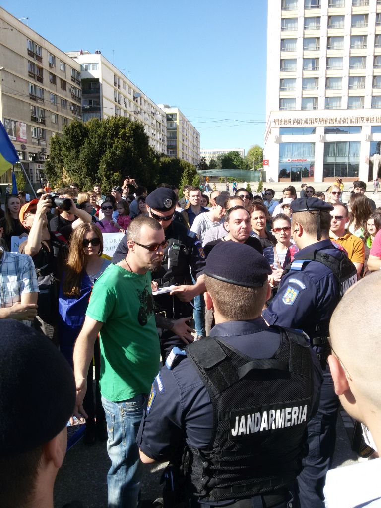 iasi 7Înainte de a se pleca spre sediul Instituției Prefectului, trei jandarmi au venit în fața unuia dintre oratori pentru a preciza că acțiunea de protest nu respectă legislația. Au început discuțiile între jandarmi și exponenții participanților. Câtorva dintre ei li s-a cerut să prezinte actele de identitate. Nu s-au înregistrat altercații între cele două părți.