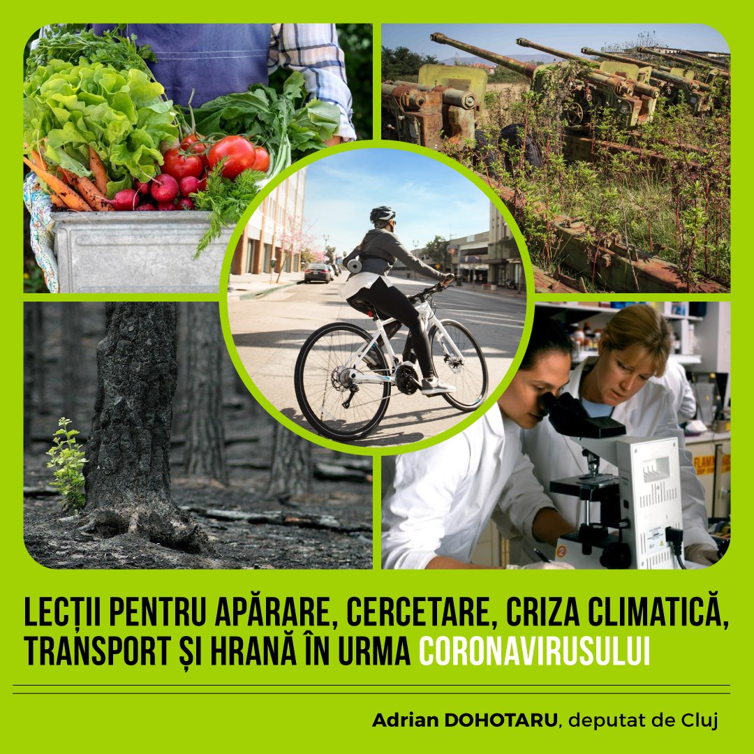 Transport sustenabil. Dezastrul coronavirusului a avut efecte pozitive în ceea ce privește scăderea poluării în orașe. Trebuie înlocuit traficul auto privat cu cel public sau nemotorizat. La nivel internațional, transportul mărfurilor trebuie mutat pe infrastructura feroviară ca să evităm blocajele traficului rutier de la granițe și numărul mare de șoferi.
