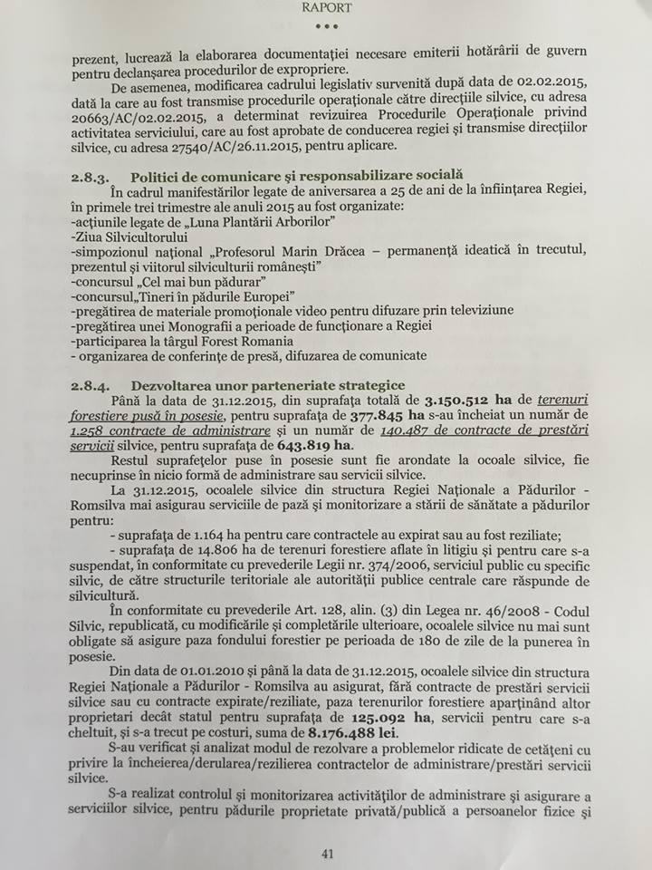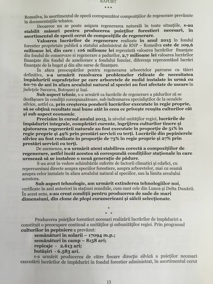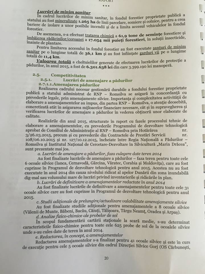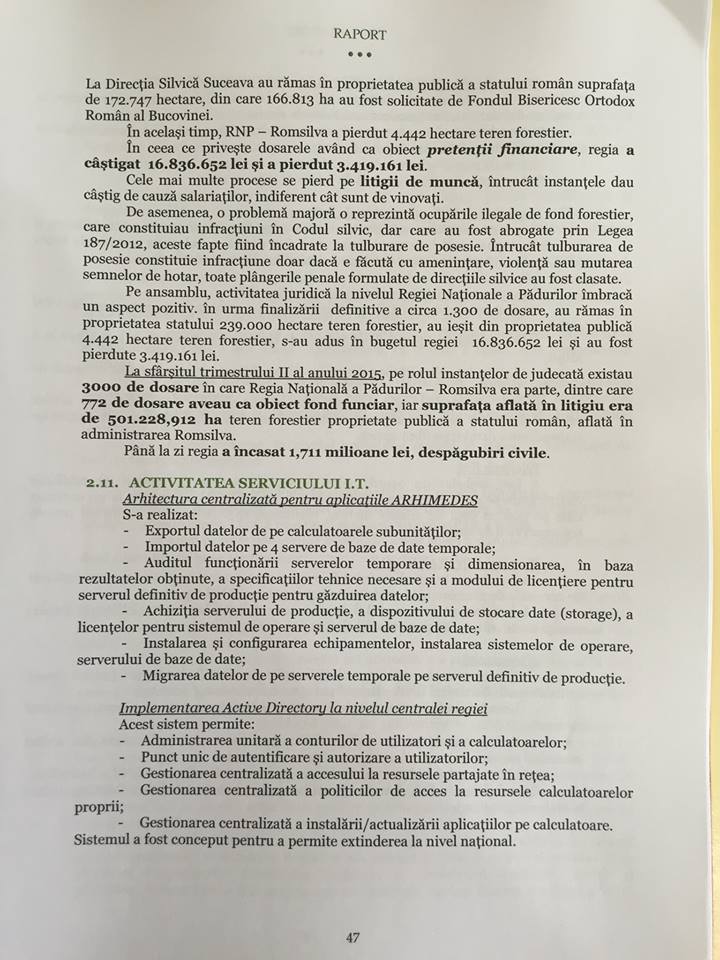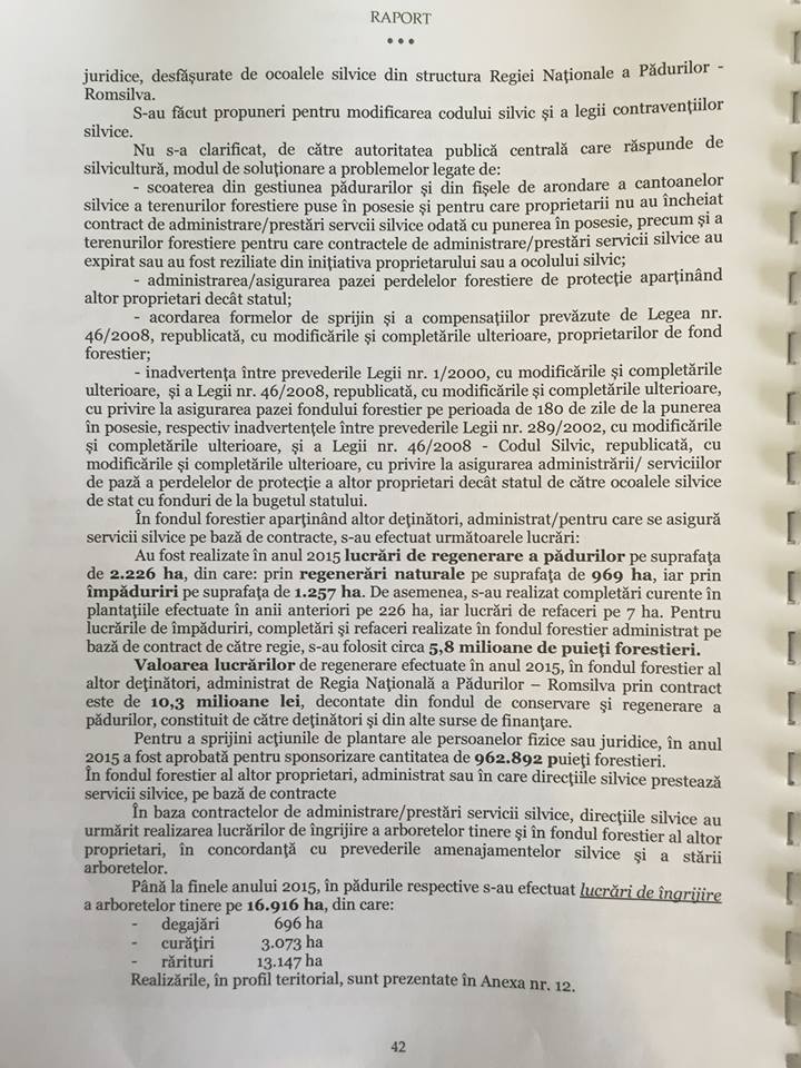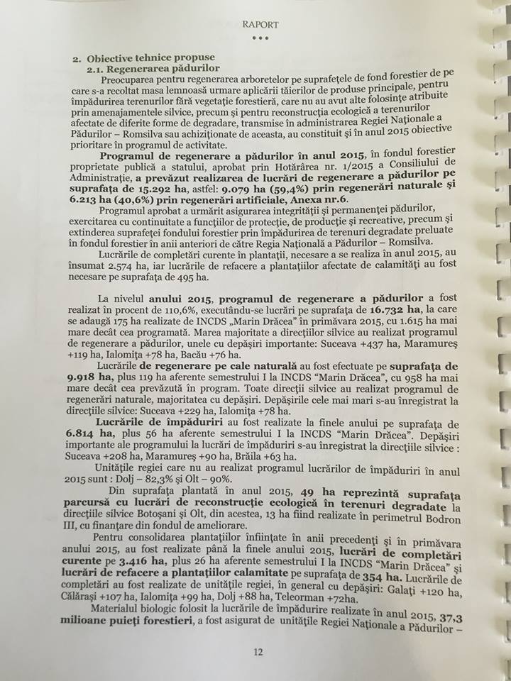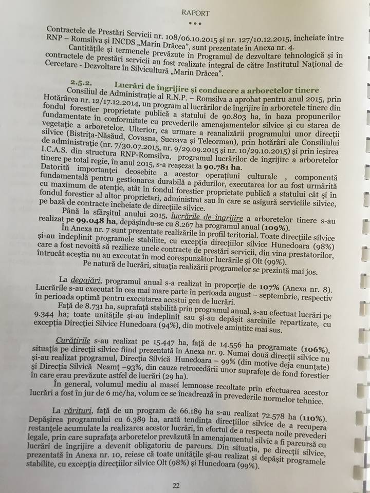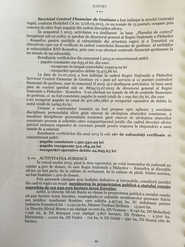 Păun acuză însă atât pe autorii raportului, cât și pe membrii CA-ului care l-au aprobat, de superficialitate, ei alocând un spațiu periferic problemei retrocedărilor ilegale, care reprezintă cauza principală a distrugerii și degradării pădurii: ”În raportul de activitate al lui Crăciunescu, această problemă este relatată, mai mult decât lacunar, pe câteva rânduri, la Capitolul 2.10 – Activitatea Juridică. Pe o jumătate de pagină, redactată fără un minim de respect, atât față de gramatica limbii române, cât și față de eventualii cititori, responsabilul activității juridice menționează că: „prin procesele câștigate prin hotărâri definitive și irevocabile, consilierii juridici din cadrul regiei au reușit menținerea în proprietatea publică a statului român suprafața de cca. 239.000 hectare teren forestier. În justificarea afirmației ce ar reflecta succesul juriștilor, sunt enumerate mai multe suprafețe, unele nominalizate pe solicitanți, altele global pe județe. Mărimea suprafețelor enumerate nu are corespondent în realitate, iar dacă însumăm cifrele prezentate ajungem la concluzia că suprafața de 239.000 ha, declarată ca succes, nu are nicio acoperire. De altfel, cu diverse ocazii mediatice, a fost lansată această cifră ca o realizare deosebită a serviciului juridic din regie, sub directa coordonare a lui Adam Crăciunescu, în încercare de a combate, în contrapondere, acuzațiile din dosarul pentru care este trimis în judecată”, afirmă Păun, care subliniază că toate exemplele pe care Crăciunescu le-a clamat ca fiind victorii personale pentru apărarea patrimoniului forestier ar fi de fapt acțiuni promovate în instanțele de judecată, în anii de dinaintea înscăunării sale la șefia Romsilva, în special când director general era Valerian Solovăstru.