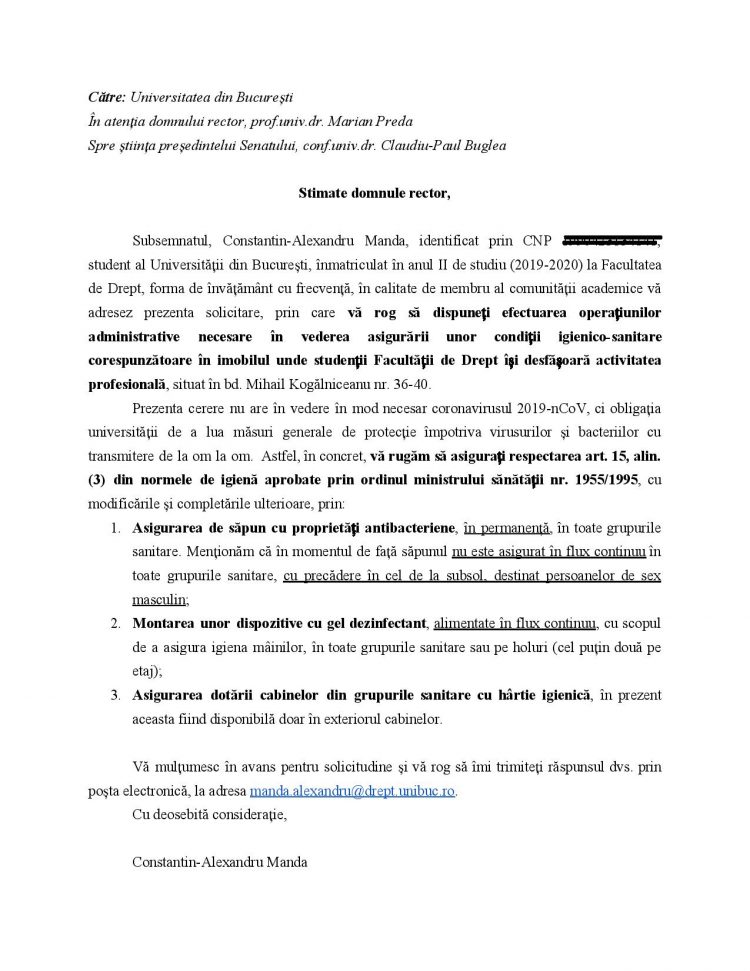 Așa că, în calitate de student al Facultății de Drept a Universității din București, i-am trimis astăzi o solicitare domnului prof. Marian Preda, noul rector al universității, prin care i-am cerut ca în imobilul din bulevardul Mihail Kogălniceanu, unde studenții de la drept ne desfășurăm activitatea, să fie respectate normele mai sus amintite. În concret, am solicitat să fie puse în practică trei operațiuni concrete: