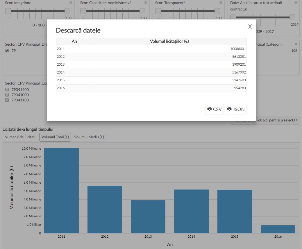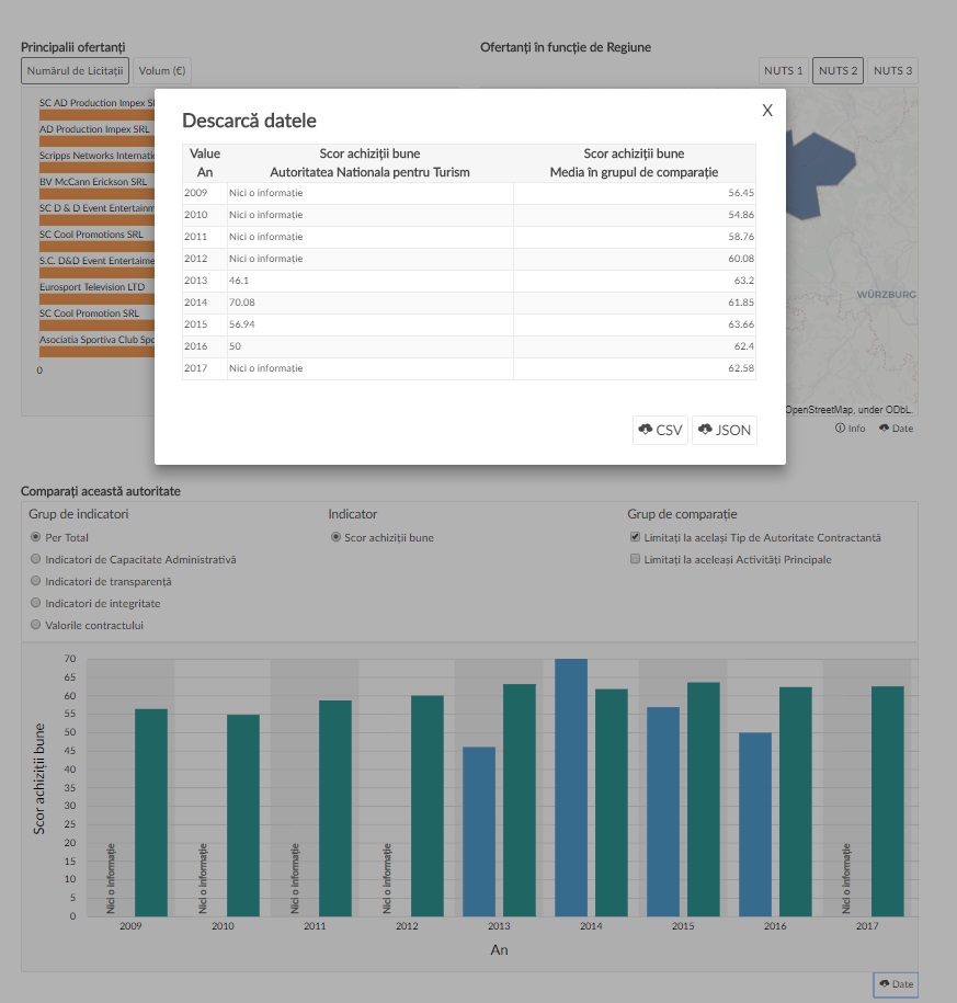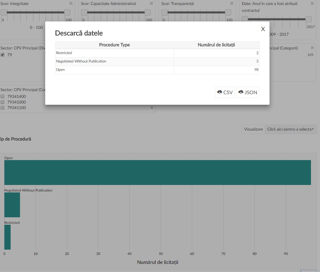 Platforma permite vizualizarea atât a unor date descriptive despre licitații individuale sau grupate în funcție de o multitudine de filtre, cât și o serie de indicatori de performanță și risc (riscurile de corupție) pentru fiecare licitație, entitate publică și ofertant în parte. Pentru această analiză, ne vom uita la ceea ce se numește „scor de achizițe bună”, i.e. media a 3 scoruri compozite: