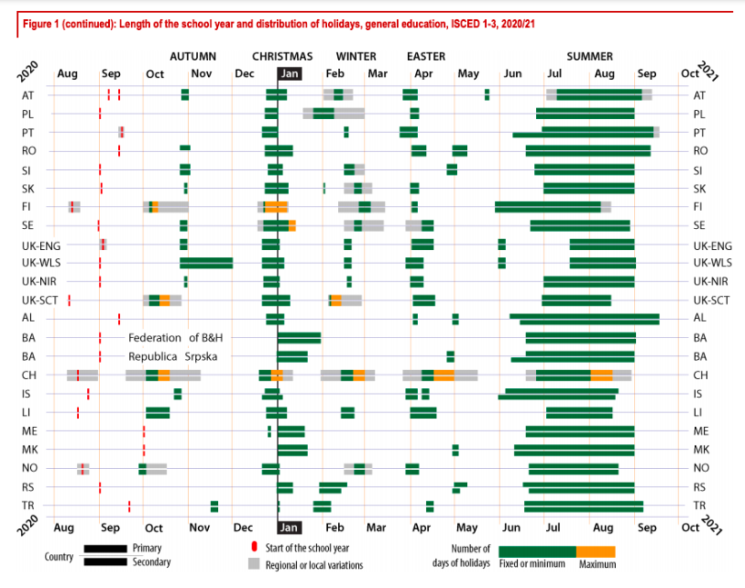 România este una dintre cele 3 țări europene care au cele mai puține zile de școală din Europa: în jur de 165, la fel ca Malta și Albania, spun experții europeni în raportul „The organisation of school time in Europe”, realizat de Agenția Executivă pentru Educație a Comisiei Europene (EACEA/Eurydice). Analiza, făcută pe anul școlar în curs, arată că la polul opus se află Danemarca și Italia, cu 200 de zile de școală, iar jumătate din țările/regiunile europene au între 170-180 de zile și în alte 17 țări/regiuni, zilele de școală variază între 181 – 190.