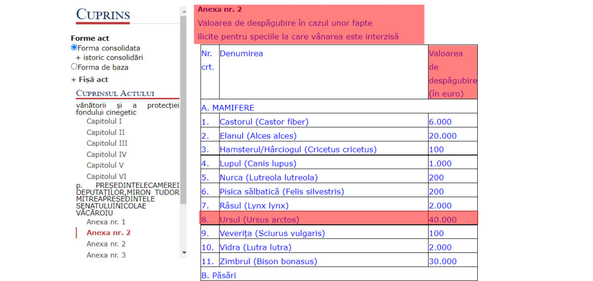 Cu toate acestea, arată Andrei Ciurcanu, în anexa 2 a Legii 407/2006, Ursus Arctos este nominalizat de legiuitor alături de râs și pisica sălbatică. Conform actului de reglementare – unde ursul brun este nominalizat la poziția 8 din tabelul mamifere – valoarea de despăgubire în cazul unor fapte ilicite pentru speciile la care vânarea este interzisă este de 40.000 de euro.