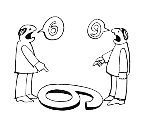 Celebra ilustraţie cu persoanele care nu ştiu dacă cifra din faţa lor este 6 sau 9 ar trebui să reprezinte tocmai subiectivitatea adevărului şi importanţa perspectivei. Fără un context adiţional, ambele păreri par la fel de întemeiate. Realitatea, însă, conţine întotdeauna un context, iar cele două personaje pot afla adevărul fie căutând alte cifre primprejur, fie întrebând, fie urmărind alte posibile indicii dacă, într-adevăr, de aflarea acestuia depinde o decizie importantă.
