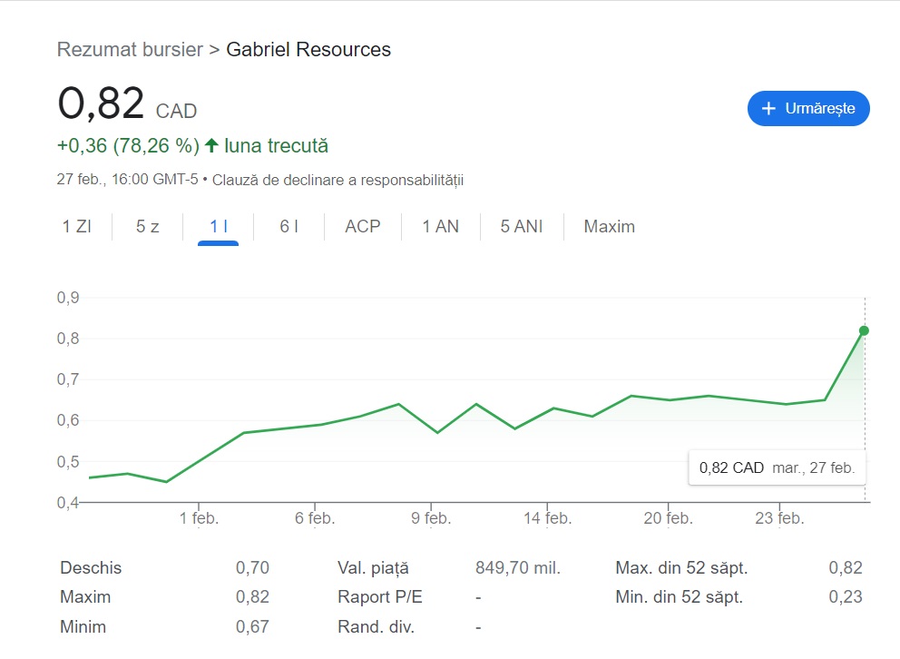 Acțiunile companiei canadiene au început să crească accelerat la sfârșitul lunii ianuarie, după ce Guvernul Ciolacu a dat ”pe surse”, în presă, informația potrivit căreia România ar urma să plătească despăgubiri de ”peste 2 miliarde de dolari” în litigiul cu Gabriel Resources de la curtea de arbitraj de la Washington. De la 0,45 dolari/acțiune a sărit la 0,65 dolari/acțiune, unde cu fluctuații ușoare, s-a stabilizat timp de aproape o lună.