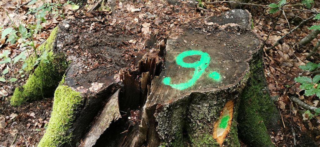 Când am ajuns la prima cioată pe care voiau să ne-o arate, aceasta era deja marcată de către echipa de control, ca fiind tăiată ilegal, cu numărul 9. Inspectorii Gărzii Forestiere (Adelin Sabău și Vasile Tupița, de la Baia Mare), șeful pazei OS Strâmbu Băiuț, Alexandru Chermezan, și pădurarul Nicolae Pop se aflau la aproximativ o sută de metri. Când ne-am apropiat, prima impresie a fost că ne aflăm pe un șantier de arheologie. Ajutându-se de crăci și de cozile topoarelor și a ciocanului de marcat, se înlătura pământul maroniu de pe o cioată impresionată. ”Are undeva pe la 80-100 de centimetri”, este evaluarea ochiometrică a unuia dintre membrii echipei de control, fapt care se va confirma, ulterior, la măsurare. ”Asta înseamnă undeva pe la 5-6 metri cubi, volumul arborelui tăiat. În jur de 2.500 de lei ar fi valoarea lui la vânzare”, estimează Alexandru Chermezan, șeful pazei OS Strâmbu Băiuț.