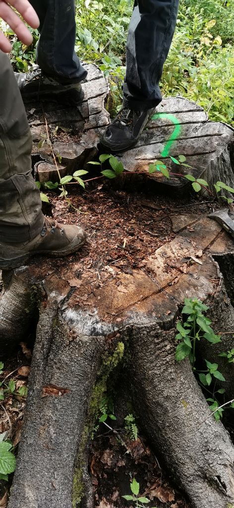 Din afirmațiile inspectorilor, asta e 6-a cioată descoperită aici în primele două zile ale controlului; noi am ajuns în a doua) și a 13-a de la începutul anului. De parcă n-ar fi fost suficienți hoții, parcela a fost devastată, recent, și de o furtună, alți arbori impresionanți, fagi și brazi, îndeosebi, fiind frânți și prăbușiți în pădure, îngreunându-ne urcușul. Rând pe rând, am văzut și celelalte cioate descoperite până acum. Cele mai multe cu aceleași dimensiuni impresionante.