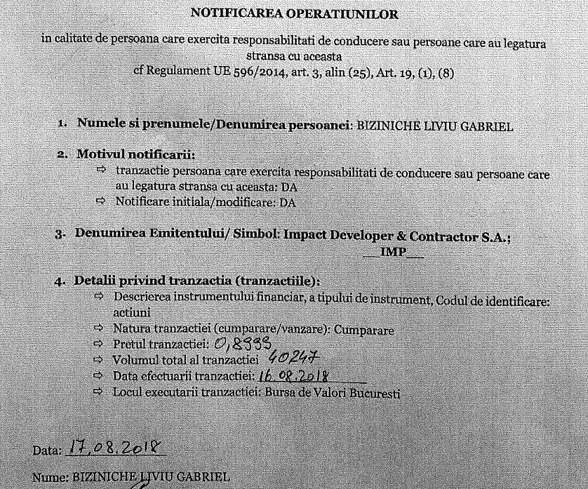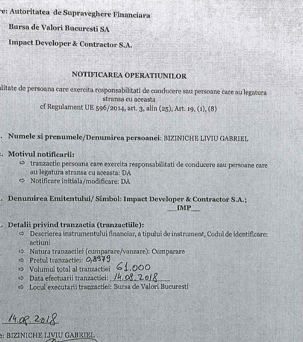 Gabriel Biziniche este numele fostului director de relații publice al societății Impact, timp de 5 ani și 9 luni (până în septembrie 2021). În același timp, conform informațiilor publice de pe site-ul companiei, între anii 2018 și 2020, Gabriel Biziniche a achiziționat, la diferite prețuri, patru pachete de acțiuni la Impact, acumulând, în total, 138.487 de acțiuni.