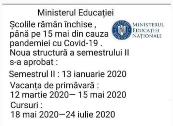 Unul dintre cele mai noi zvonuri false a fost închiderea școlilor până pe 15 mai și aprobarea unei noi structuri ale anului școlar până în 24 iulie. În timp ce această informație a generat o mulțime de distriburi, panică în rândul elevilor și sfaturi în mod clar periculoase în urma afirmațiilor doamnei vicepremier, Raluca Turcan, care a precizat că sunt luate în clacul mai multe variante printre care și înghețarea anului școlar, ministrul Educației, Monica Anisie, îi asigură pe elevi, studenți, profesori și părinți că în acest moment nu se ia în calcul înghețarea anului școlar sau înghețarea examenelor cu un an și a afirmat că noua structură a celui de-al doilea semestru care circulă în aceste momente pe social media este un fals, declarând că specialiștii din cadrul ministerului analizează mai multe variante care vor fi transmise în funcție de evoluția pandemiei.