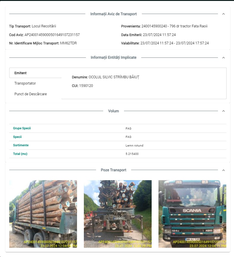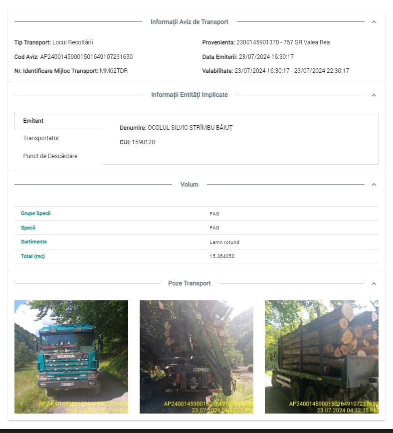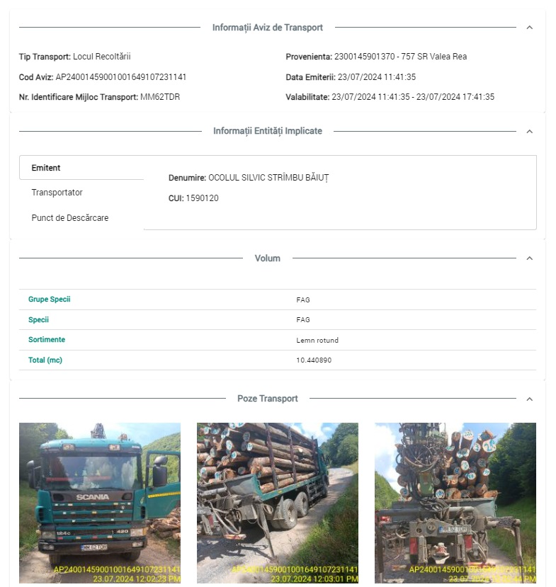 La întoarcerea la Cluj, m-am gândit să fac și o scurtă verificare în Inspectorul Pădurii cu numărul camionului MM62TDR, cel încărcat cu bușteni, pe marginea drumului forestier, când am fost opriți de patronul firmei Exploatare Poiana. Și am descoperit lucruri cel puțin ”interesante”. Mai exact, pentru camionul cu acest număr, în data de 23 iulie 2024, au fost emise trei avize de însoțirea materialului lemnos. Unul la ora 11.41, al doilea 16 minute mai târziu, la ora 11.57, iar cel de-al treilea la ora 16.30 (cel emis chiar în momentul în care am început să filmez camionul).