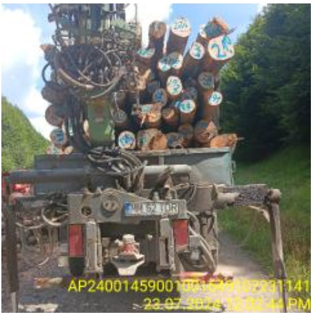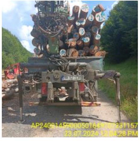 ”Ciudățenia” e că în primul aviz, de la ora 11,41, volumul de lemn este de 10,4 mc, în timp ce în avizul emis 16 minute mai târziu, volumul este fix la jumătate, de 5,2 mc. Ca și cum camionul ar fi fost descărcat între timp, nu încărcat suplimentar! Cireașa de pe tort: atât în avizul de la ora 11,41, cât și în cel de la ora 11,57, o fotografie (cea din spatele camionului) este dublată (e aceeași). Chit că într-un caz se pretinde că în camion s-ar afla 10,4 mc de material lemnos, iar în cel de-al doilea caz 5,2 mc!