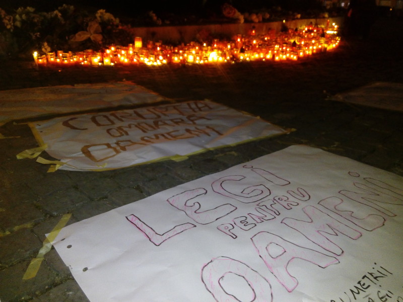 Tot în centrul Iașului, dar pe bulevardul Ștefan cel Mare, trecătorii au început să aprindă lumânări lângă o hârtie pe care scrie: ”Pentru cei morți, arși de vii, la București”.