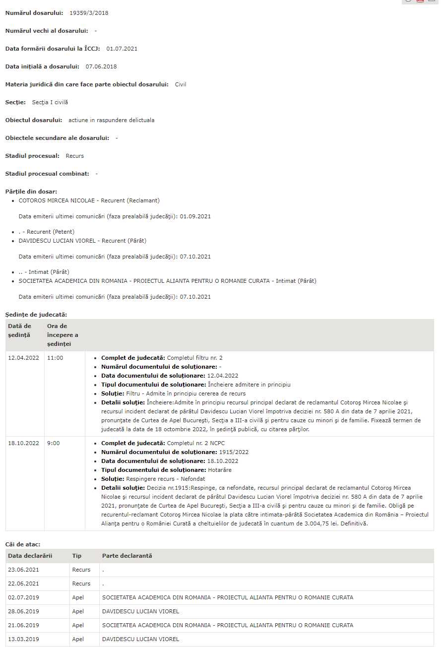 Update 3: Întrucât toate informațiile despre dosare au dispărut fără urmă de pe portalul instanțelor de judecată, probabil chiar la cererea procesomanului (despre celălalt proces nefondat pe care l-a deschis și pierdut cu ziariștii puteți citi la acest link), le reluăm integral în cele ce urmează: