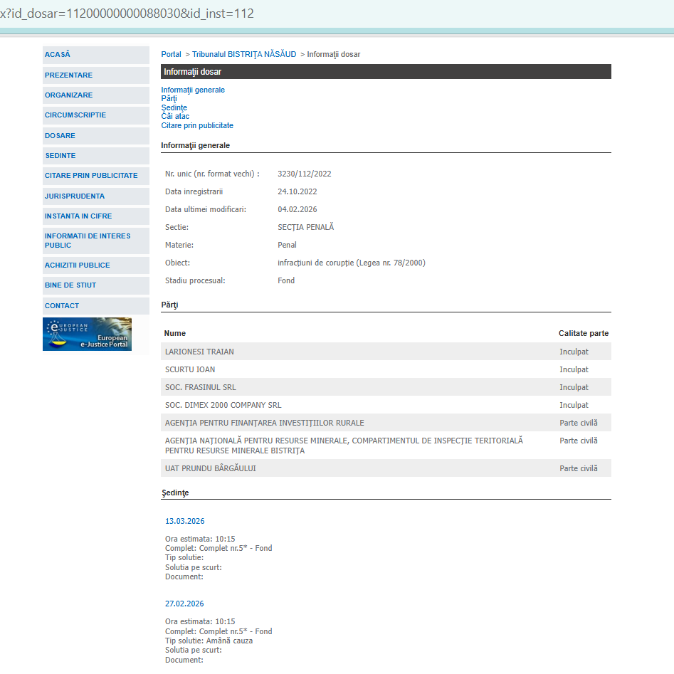 Interesant însă, e faptul că atât Dimex, cât și administratorul acesteia, Ioan Scurtu, sunt inculpați într-un proces penal de corupție, care e tergiversat la Tribunalul Bistrița-Năsăud din noiembrie 2022! Cum faptele vizate de în dosar ar fi fost săvârșite în perioada 2014-2015, prescripția de apropie cu viteză. De salvarea prin prescripție în acest dosar nu ar beneficia doar Dimex și Ioan Scurtu, ci și o altă ”celebră” companie din Bistrița-Năsăud, Frasinul, și patronul acesteia, Traian Larionesei, cunoscut și ca ”Fierăstrăul Codrilor”.