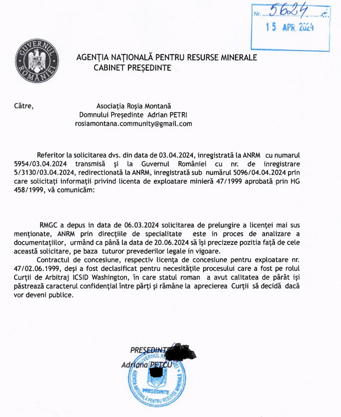 - Răspunsul ANRM adresat asociației din Roșia Montană