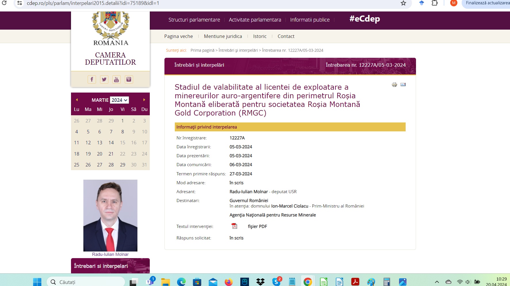 - Întrebarea parlamentară adresată lui Marcel Ciolacu și ANRM, de către deputatul USR de Cluj Radu Molnar, legată de licența minieră pentru Roșia Montană nu a primit răspuns, deși termenul legal era 27 martie 2024.
