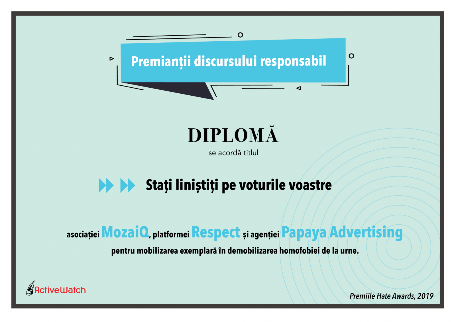 Începem cu partea bună, pozitivă, în care asociația MozaiQ, platforma Respect și agenția Papaya Advertising am primit un premiu pentru discursul responsabil intitulat “stați liniștiți pe voturile voastre”. SAR este membru activ al platformei Respect încă din anul 2017, în cazul în care vă întrebați de unde și până unde folosirea narațiunii la persoana întâi. Premiul a fost acordat pentru mobilizarea exemplară în demobilizarea homofobiei de la urne.