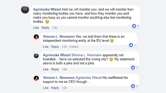 Antepronunțările sunt de asemenea neobișnuite la acest nivel:„Din perspectiva noastră, unele dintre problemele punctate de el (Florin Iepan n.r.), majoritatea, sunt din cauza finanțării asociației, care după cum spuneam, atrage după sine alte probleme”, asuma dl.Suchánek, președintele comisiei, la plural. O corespondență pe Facebook dintre Simona Neumann și Agnieszka Wlazel arată un tip de relație sub standardele prevăzute pentru comisiile de monitorizare europene (vezi captura publicată de ZdV):