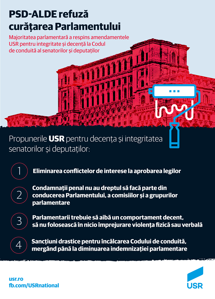 În acest sens, USR a propus mai multe amendamente pentru integritate și decență în Parlament la dezbaterea privind Codul de conduită al senatorilor și deputaților, amendamente care, spune USR, au înfuriat majoritatea PSD-ALDE.