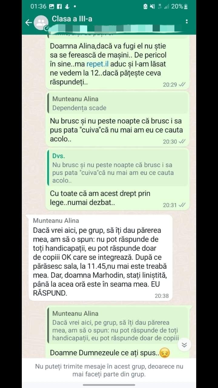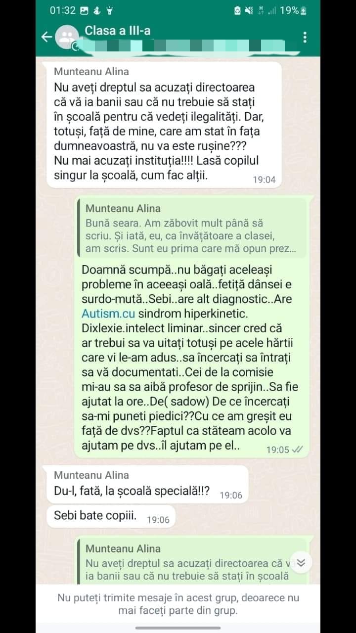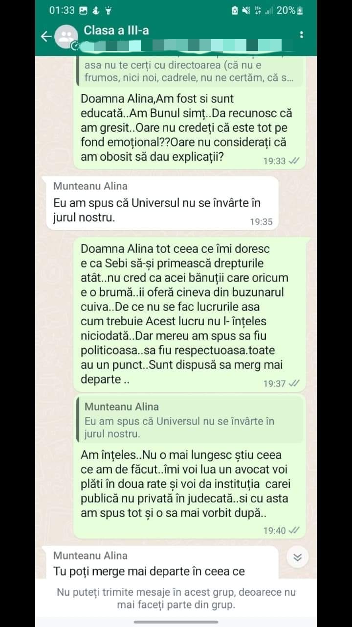 Nota bene: Materialele foto au fost trimise de către Ileana Marhodin, mama lui Sebastian, care ne-a oferit acordul de a posta articolul și pozele pentru a ajuta cât mai mulți copii să nu mai treacă prin experiența lui Sebastian. Screenshot-urile conversației de pe whatsapp fac parte din conversația de pe grupul clasei dintre mama și învățătoare, iar cele de pe messenger sunt între Georgiana Sirbu (sora lui Sebastian) și aceeași învățătoare.