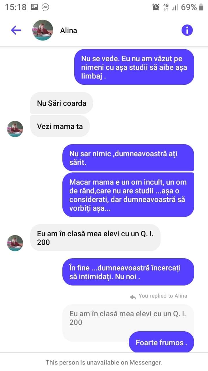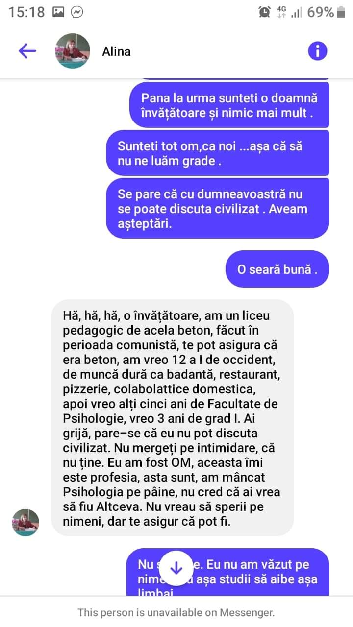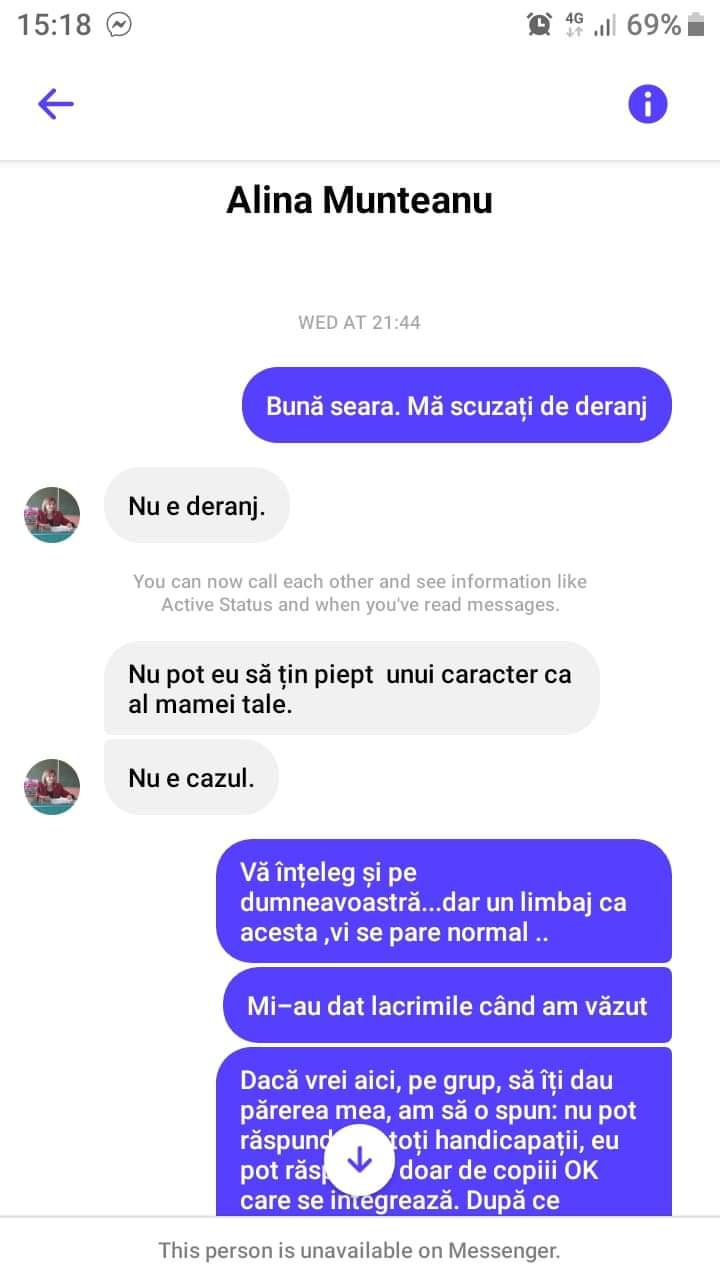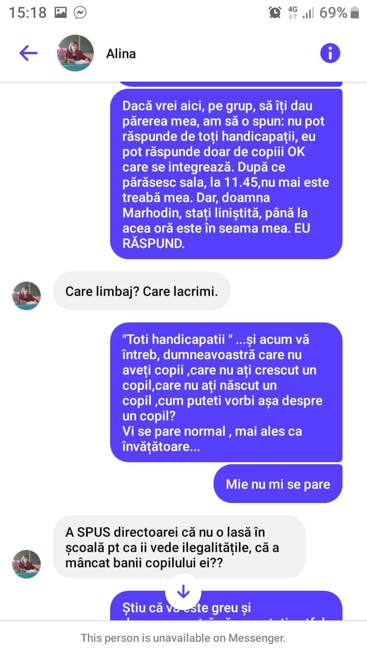 Nota bene: Materialele foto au fost trimise de către Ileana Marhodin, mama lui Sebastian, care ne-a oferit acordul de a posta articolul și pozele pentru a ajuta cât mai mulți copii să nu mai treacă prin experiența lui Sebastian. Screenshot-urile conversației de pe whatsapp fac parte din conversația de pe grupul clasei dintre mama și învățătoare, iar cele de pe messenger sunt între Georgiana Sirbu (sora lui Sebastian) și aceeași învățătoare.