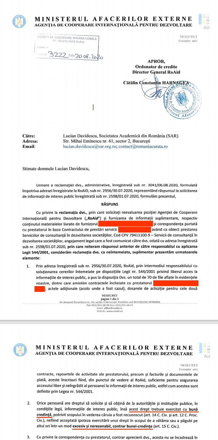 Iată răspunsul la o solicitare pe care am făcut-o către ROAID, o agenție a MAE condusă de fostul șef SIE Cătălin Harnagea.