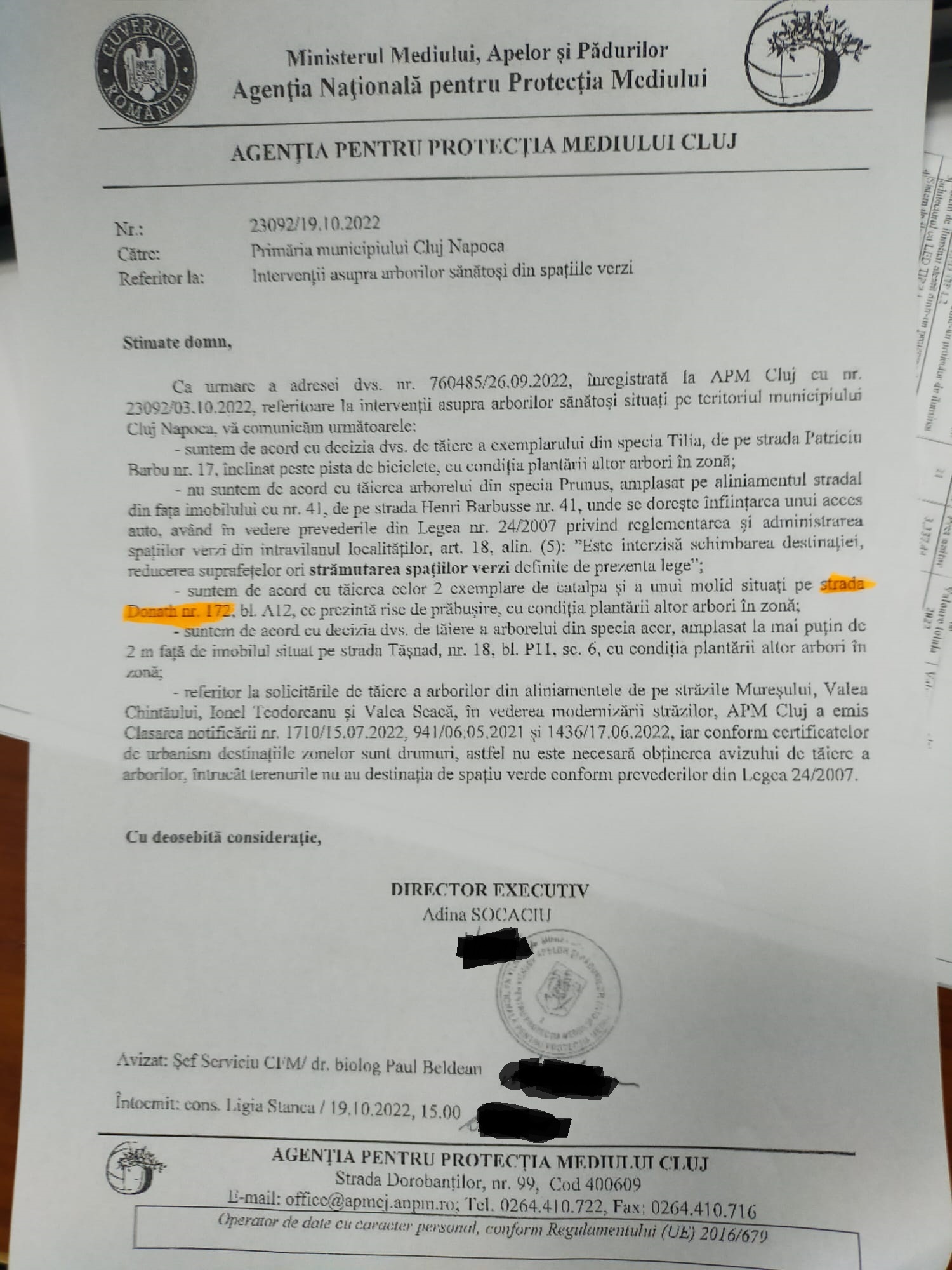 Nota bene: în adresa APM Cluj (mai jos) se menționează de plantare a altor copaci în locul celor tăiați, ca și condiție a tăierii. Să nu credeți că s-a plantat ceva!