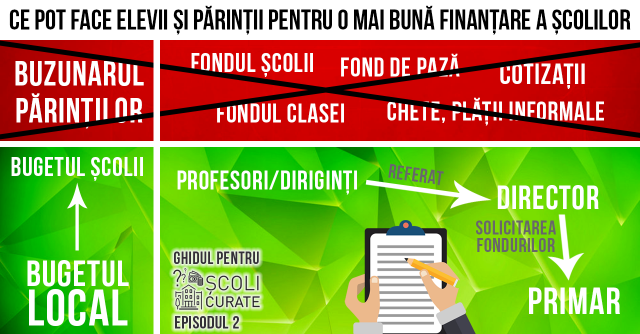 Acum suntem aici. Și avem de făcut o alegere, atât elevii, cât și părinții. Vrem responsabilitate din partea celor cu pixul în mână sau doar să cârpim lucrurile fiecare pe bucățica lui? Pentru a doua variantă, este suficinet să continuăm ceea ce facem. Însă, dacă ce ne dorim este o schimbare trebuie să luăm atitudine și să spunem nu subfinanțării, indiferenței și managementelui defectuos al școlilor. Cere directorului școlii ca în loc să susțină/accepte strângerea sumelor informale să facă un referat de necesitate către Primărie, iar printr-o acțiune comună: elevi, părinți, profesori, director, să cereți autorităților locale să suplimenteze bugetul școlii. Schimbarea începe la firul ierbii, iar de atitudinea fiecăruia depinde perpetuarea sau nu a acestui flagel.