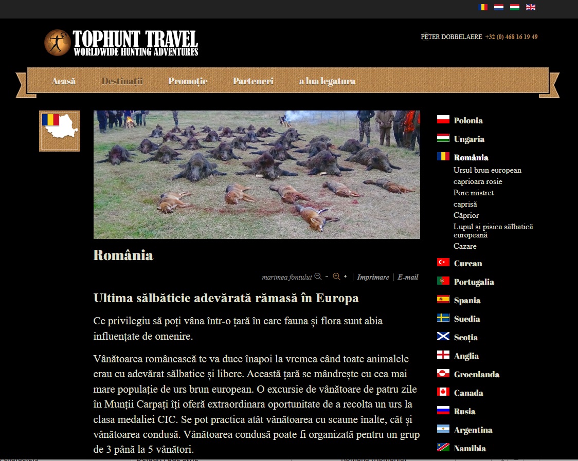 ”De mulți ani încoace, Tophunt Travel este un punct de contact important pentru vânătorii europeni și americani care caută o experiență de vânătoare de primă clasă la nivel mondial sau o excursie personalizată de vizitare a obiectivelor turistice”, se arată pe site-ul agenției.