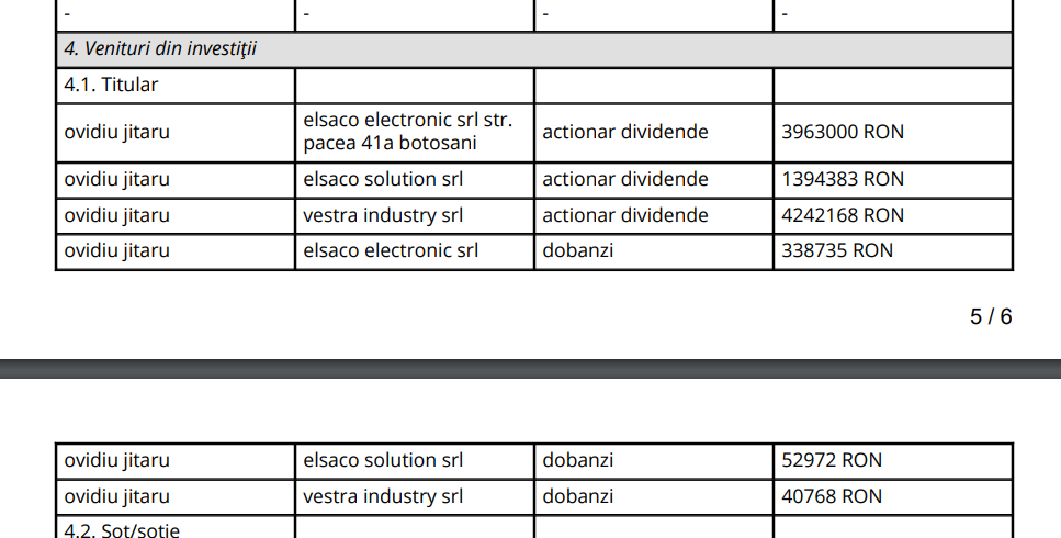 De altfel, Elsaco Electronic a fost una extrem de profitabilă în ultimul an raportat – o cifră de afaceri de 425,5 milioane de lei, cu un profit de 35,3 milioane de lei (peste 7 milioane de euro). De profitul firmei a beneficiat și Ovidiu Jitaru, ajuns, tot anul trecut, senator de Botoșani, adică unul dintre cei care va decide, prin vot, adoptarea OUG 144/2024. Senatorul de Botoșani a încasat, în 2023, un salariu de 128.120 de la lei de la firma în care era asociat cu Valeriu Iftime, precum și dividende și dobânzi în valoare totală de 4,3 milioane de lei.